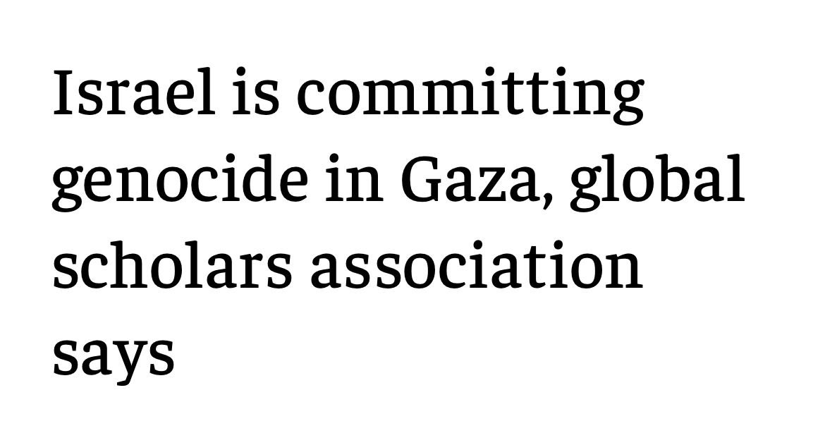 I ett samstämigt och ovanligt uttalande har världens främsta experter på folkmord formellt fastslagit att Israels krig i Gaza uppfyller den juridiska definitionen av folkmord enligt FN-konventionen. Detta framgår av en resolution från den internationella forskarföreningen International Association of Genocide Scholars (IAGS), som antagits med 86 procents majoritet av de som deltog i omröstningen. 28 % av medlemmarna i föreningen deltog i omröstningen. Att Israel begår folkmord och att intentionerna funnits har länge varit känt – redan i början i oktober 2023 kom flera uttalanden från Israeliska ledare som uppmanade till en förintelse av Gaza.