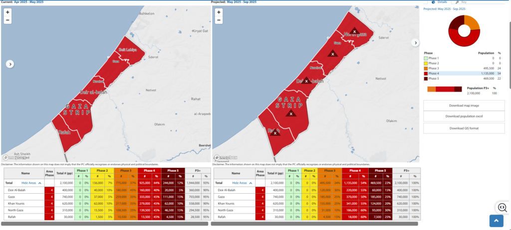 FN:s IPC varnar för att hungersnöd – den allvarligaste nivån på den femgradiga svältskalan – redan har inträffat i stora delar av Gaza. Prognoserna är skrämmande: antalet dödsfall, särskilt bland barn, förväntas öka dramatiskt i närmaste framtid. I rapporten från maj 2025 var dåvarande situation att 244 000 av befolkningen lider av famine. I augusti/september 2025 är prognosen att 469 500 av Gazas befolkning att lida av akut svält. Det är 22 % av befolkningen. Barn och gravida och ammande kvinnor är de mest utsatta. Israel har systematiskt vägrat släppa in mjölkersättning och annan humanitär hjälp in i Gaza.