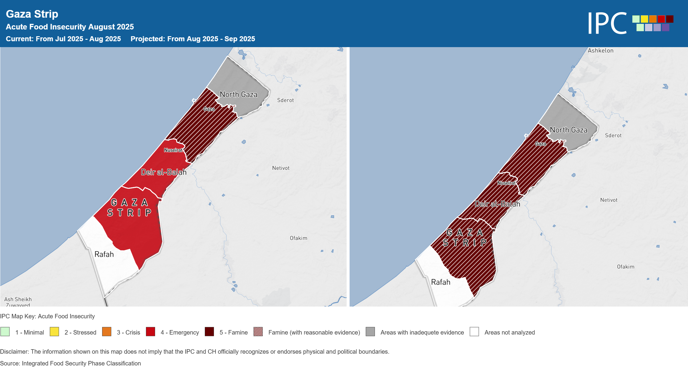 Rapporten, publicerad den 22 augusti 2025, visar att minst 641 000 människor – varav över en halv miljon redan nu – befinner sig i katastrofal svält (IPC Phase 5), medan 1,14 miljoner befinner sig i nödsituation (IPC Phase 4). Sammanlagt lever 96 % av Gazas befolkning under katastrofala eller allvarliga hungerförhållanden.